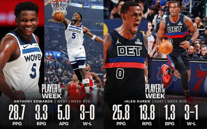 来自NBA官方的消息,最新一期的周最佳球员出炉:西部爱德华兹,东部杰伦杜伦。