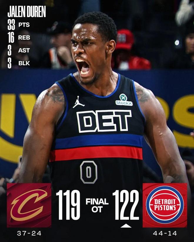这场虽然米切尔+哈登缺席,但是活塞赢得并不容易,杜伦第四节单节11分5板+加时赛4分3板,帮助活塞3分险胜对手,个人正负值则高达+14。