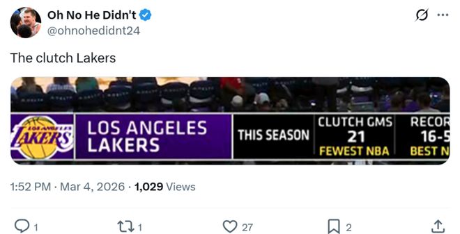 三人关键时刻夸张的能力也直观展现在湖人队战绩方面,本场比赛拿下胜利后,湖人队本赛季关键时刻(最后5分钟分差5分以内)拿下17胜5负联盟第一战绩。