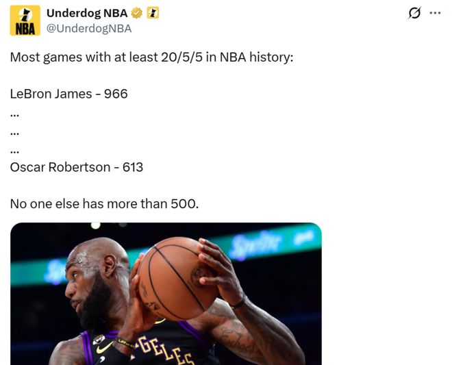 同时这是詹姆斯生涯第966场至少拿到20分5板5助,NBA历史断档第一,大O以613场排在第二,两人也是NBA历史上唯二至少500场拿下20+5+5的球员。