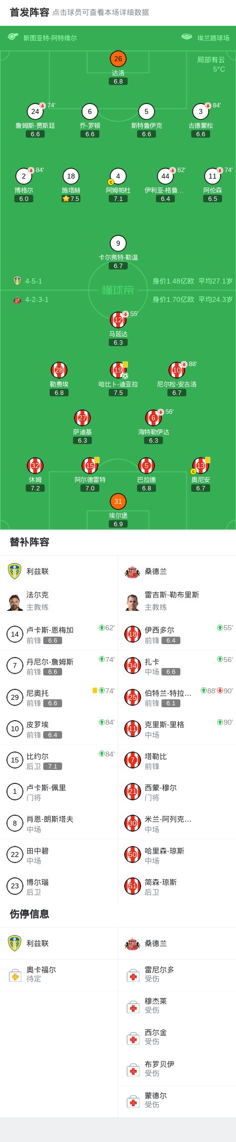 第69分钟,阿姆帕杜手球送点,迪亚拉主罚命中,利兹联0-1桑德兰
